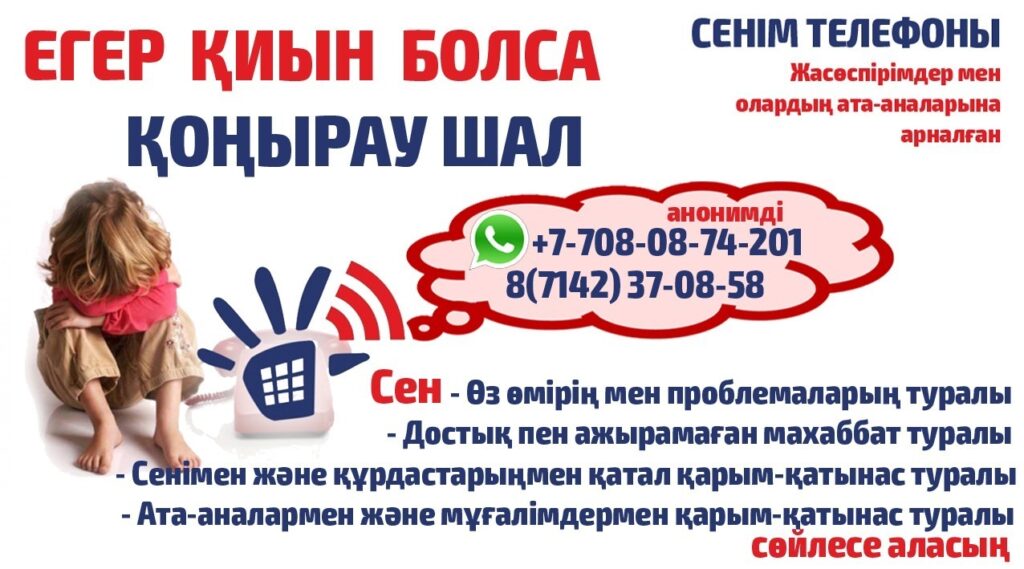 Балаларға, жасөспірімдерге және олардың ата-аналарына психологиялық және кеңес беру көмегін көрсету мақсатында тәулік бойы жұмыс істейтін сенім телефоны туралы ақпарат беріледі.